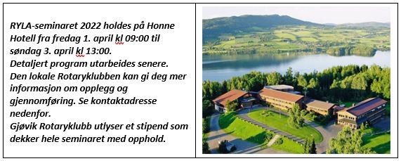 Rotary Youth Leadership Award er et seminar for unge mellom 18 og 30 år. Målsettingen er å gi fremtidens ledere impulser og ideer til godt lederskap. Gjøvik Rotaryklubb sponser deltakelsen på seminaret for en deltaker. Søknadsfrist er 20. februar 2022. Se også info nederst på siden!SEMINAR OM LEDELSE: