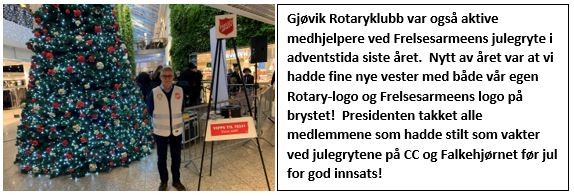 President Tor Odd Silset kunne 19. januar ønske velkommen til det første møtet i Gjøvik Rotaryklubb etter nedstengningen, som varte fra starten av desember til midten av januar. Fortsatt gjelder strenge smittevernregler, men alle er glade for å kunne møtes igjen!KAFFEMØTE MED ROTARYSTOFF