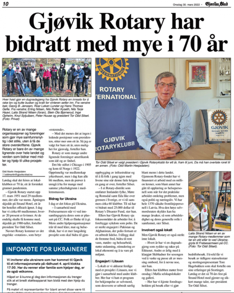 Gjøvik Rotaryklubb har passert 70-år og skal feire dette med en jubileumsfest den 2. april. Gjøviks Blad har i denne forbindelsen laget et oppslag om Rotaryklubben. Både de ukentlige aktivitetene og flere av samfunnsengasjementene omtales.