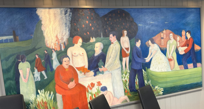 Spisesalen til Hunton har tre store malerier av Rudolph Thygesen med titlene Arbeid, Fritid og Fest.