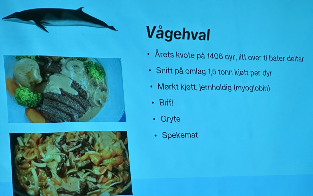 Dagens sjømat Vågehvalen, i en bredere presentasjon enn vanlig. Den lever globalt i adskilte stammer. Den norske kvoten er i år på 1400 dyr fordelt på ca. 10 båter. Totalt ca 150 ton kjøtt hvorav ca 30% med biffkvalitet. Den er smaksrik og minst like god som biff av storfe. Sashimikvalitet selges i Gjøvik. Stekes på sterk varme og serveres som «medium minus» - mindre enn til medium.