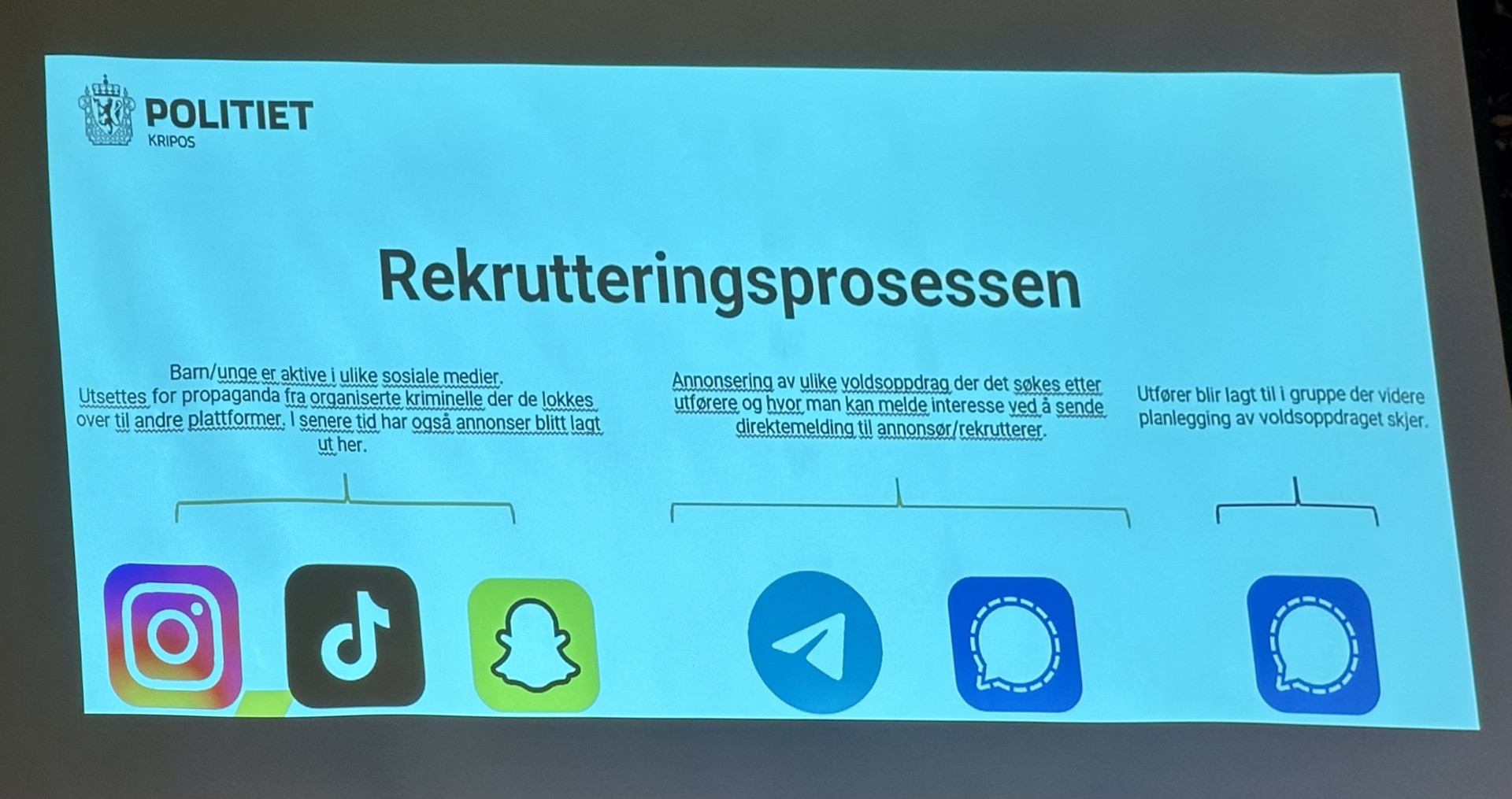 «Crime at a service» Unge blir rekruttert til å begå krimhandlinger via sosiale medier. Vi vet at 90% av barn ned til 9 år er på sosiale medier. De kriminelle forstår at det er der di må være. Bl. a benyttes krypterte apper som er umulig å lese både for politi og foreldre. Ungdom som begår kriminelle handlinger har ofte få beskyttelsesfaktorer som aktive foresatte, har gitt opp skolen, osv.